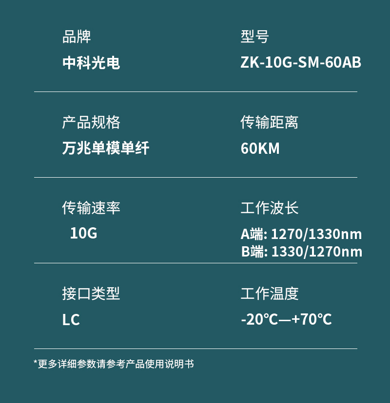 中科光電 萬兆光模塊 10G光纖模塊萬兆單模光模塊SFP+單模單纖1270/1330nm,60KM,LC接口 一對 ZK-10G-SM-60AB